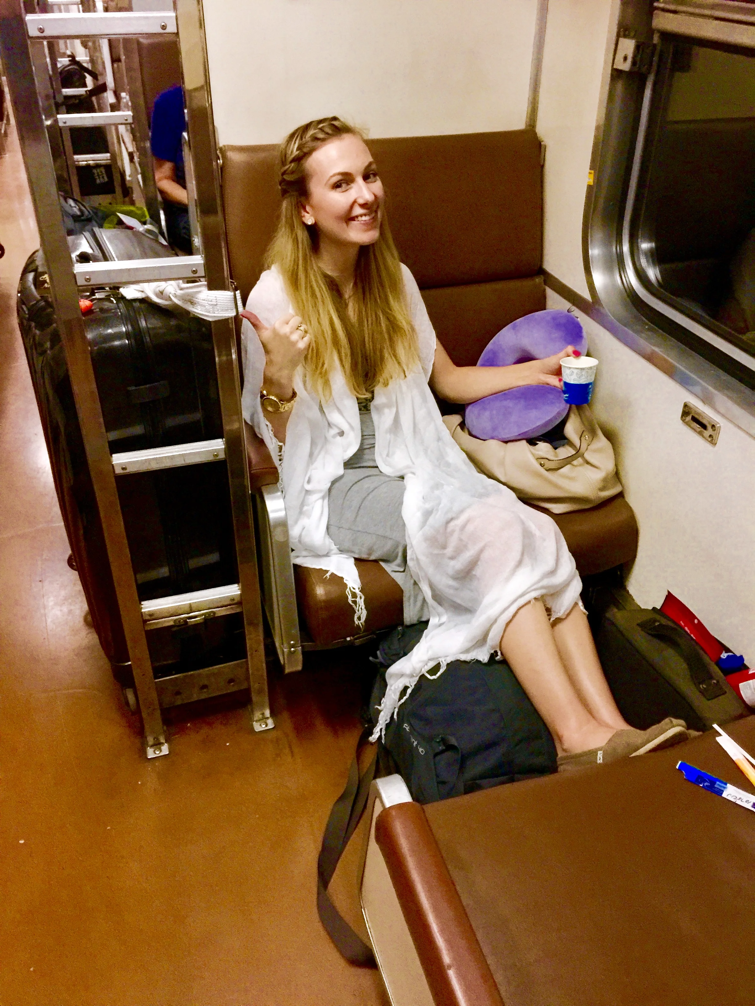 On the seats that fold into the bottom bunk of the night train to Chiang Mai